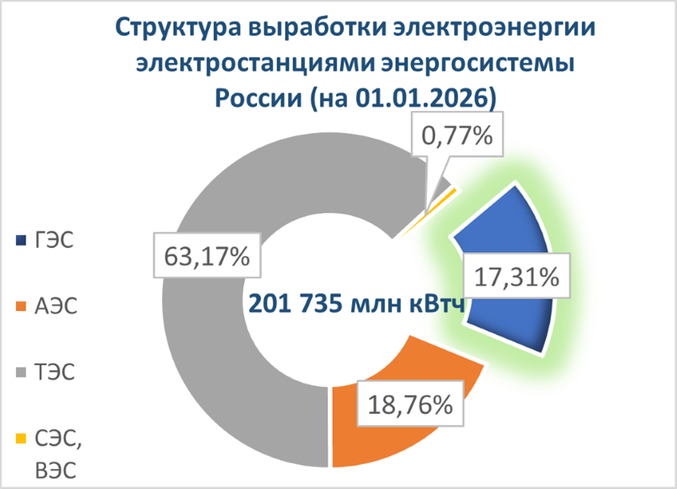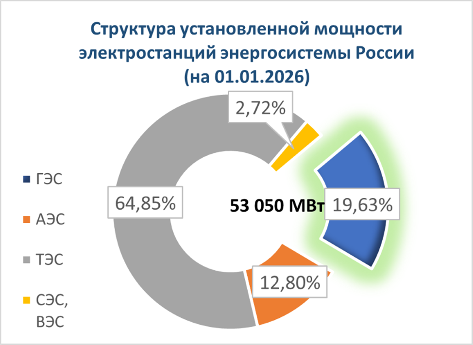 Гидроэнергетика является важнейшей частью электроэнергетики России. Общая мощность гидроэлектростанций Российской Федерации (ГЭС и ГАЭС) по состоянию на 01.01.2026 года - 53,05 ГВт, что составляет около 20% общей мощности всех электростанций Российской Федерации (270,3 ГВт).