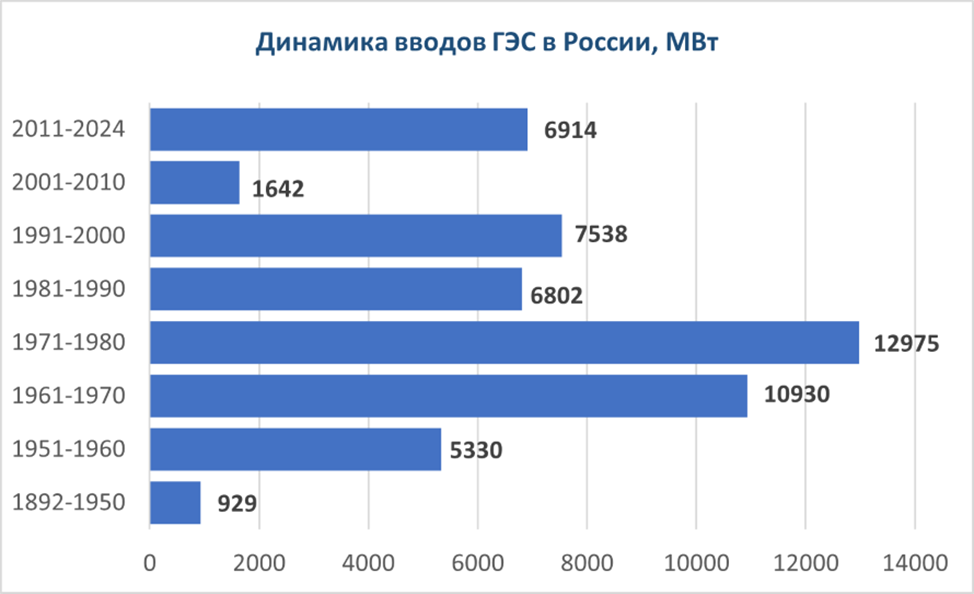 На 1940-1950-е годы пришелся пик строительства малых ГЭС, когда ежегодно в эксплуатацию вводилось до 1000 объектов. Общее количество малых ГЭС в СССР после окончания ВОВ составляло 6500 единиц.