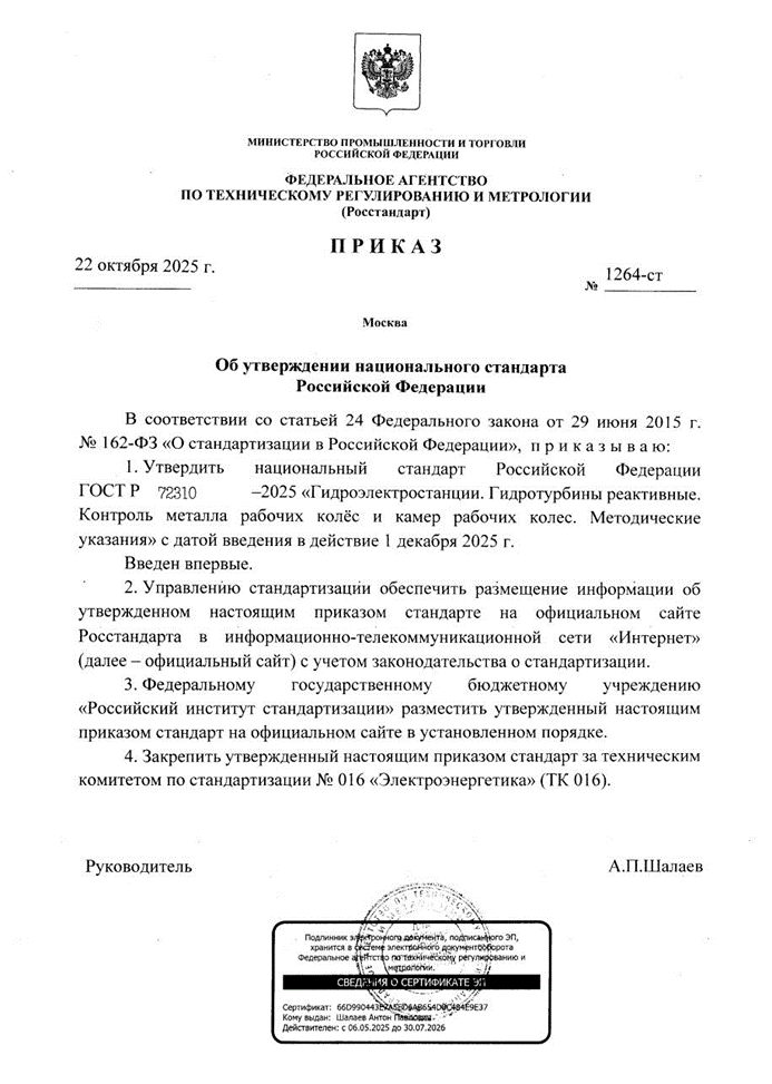 Приказом Федерального агентства по техническому регулированию и метрологии от 22.10.2025 № 1264-ст утверждён национальный стандарт Российской Федерации ГОСТ Р 72310-2025 «Гидроэлектростанции. Гидротурбины реактивные. Контроль металла рабочих колес и камер рабочих колес. Методические указания».